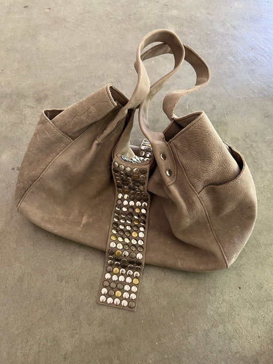 TRES Studded Leather Tote — Distressed Taupe