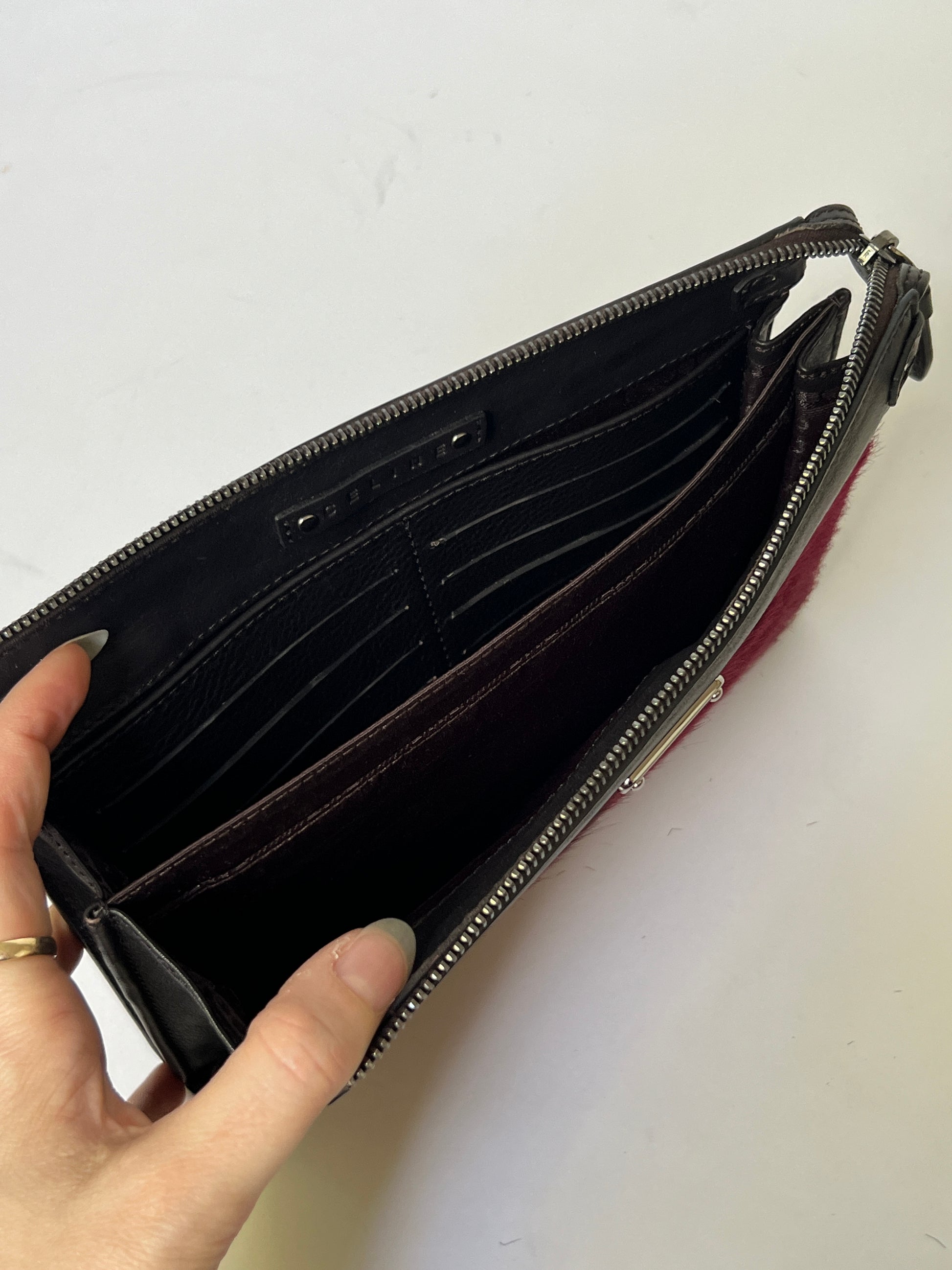 Rich oxblood pony hair contrasted with smooth black leather trim.