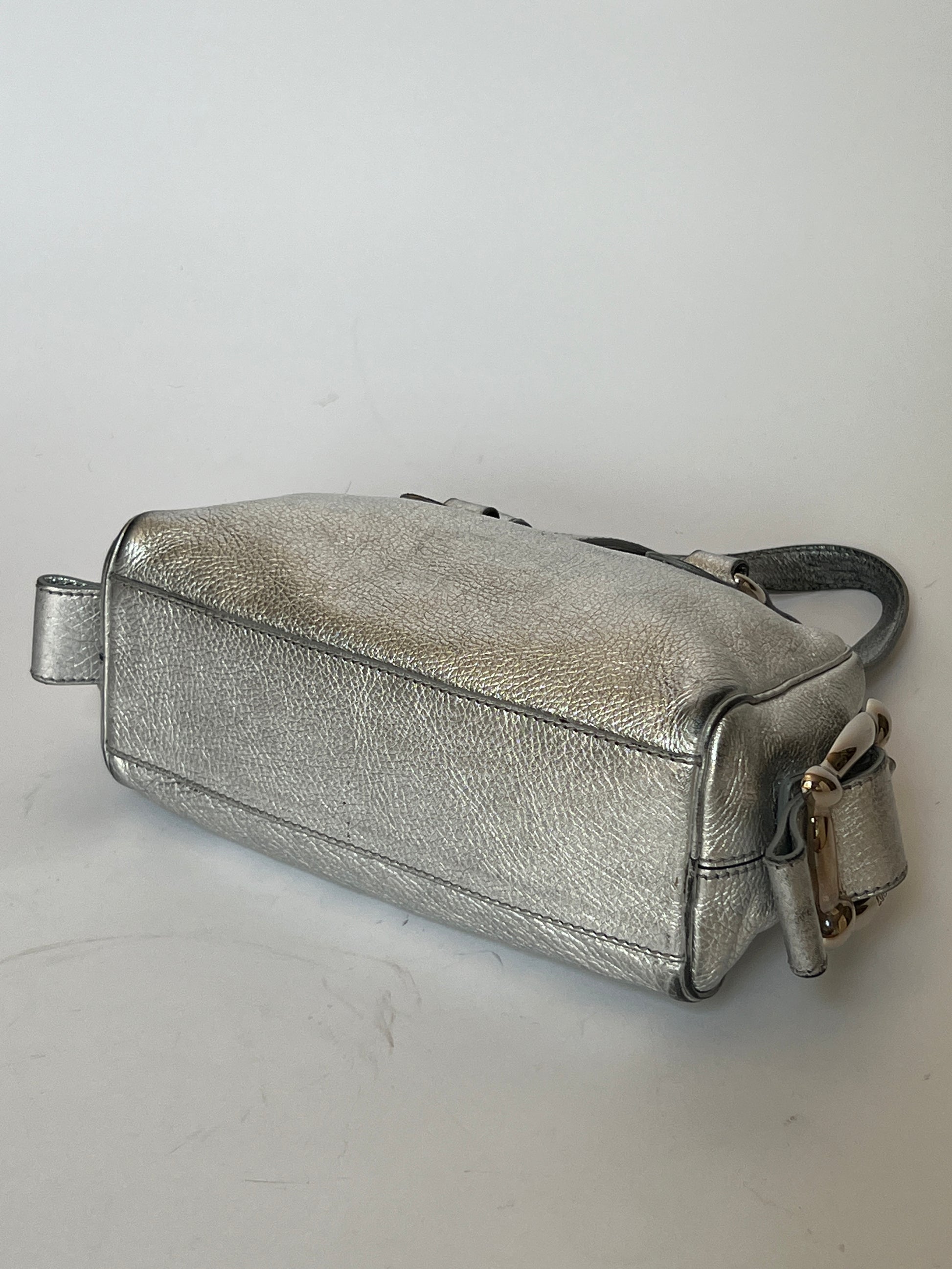 Early-2000s Dolce & Gabbana mini bag in metallic silver leather, featuring a structured barrel silhouette and signature sculptural buckle hardware at the sides.