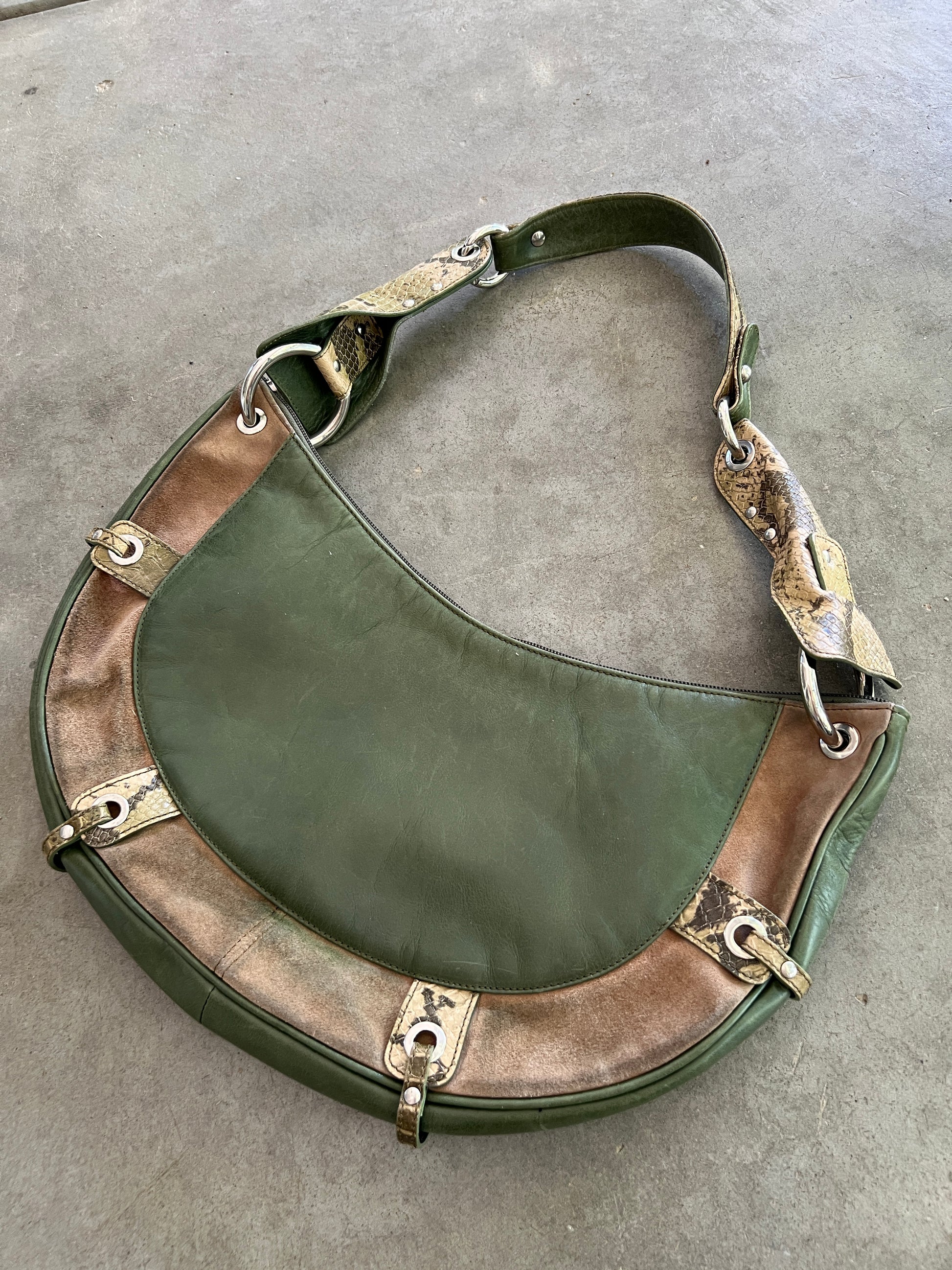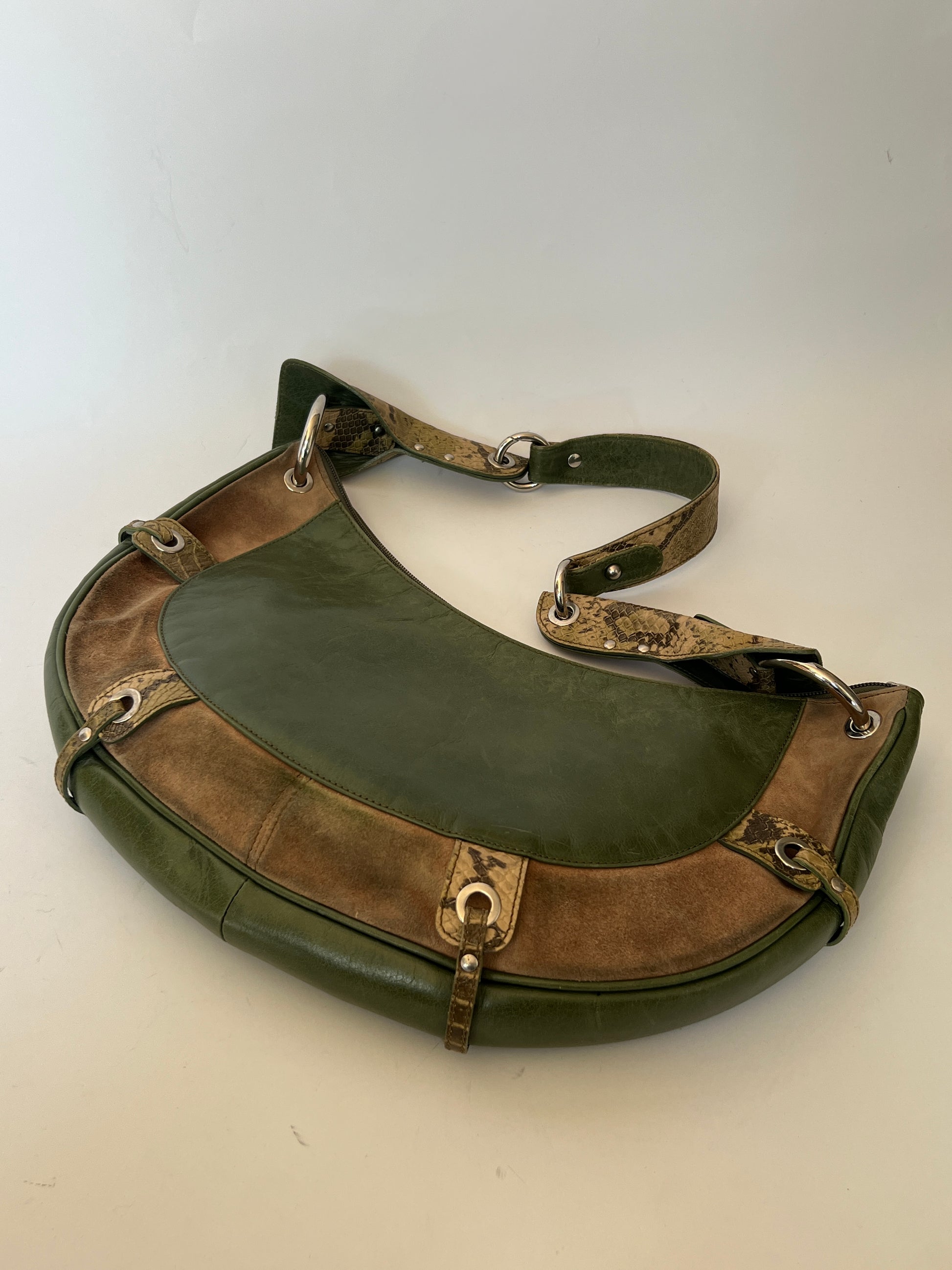 An elevated Italian leather piece from Angelo Carbotti — rich olive and tan suede tones contrasted with python detailing and polished hardware.