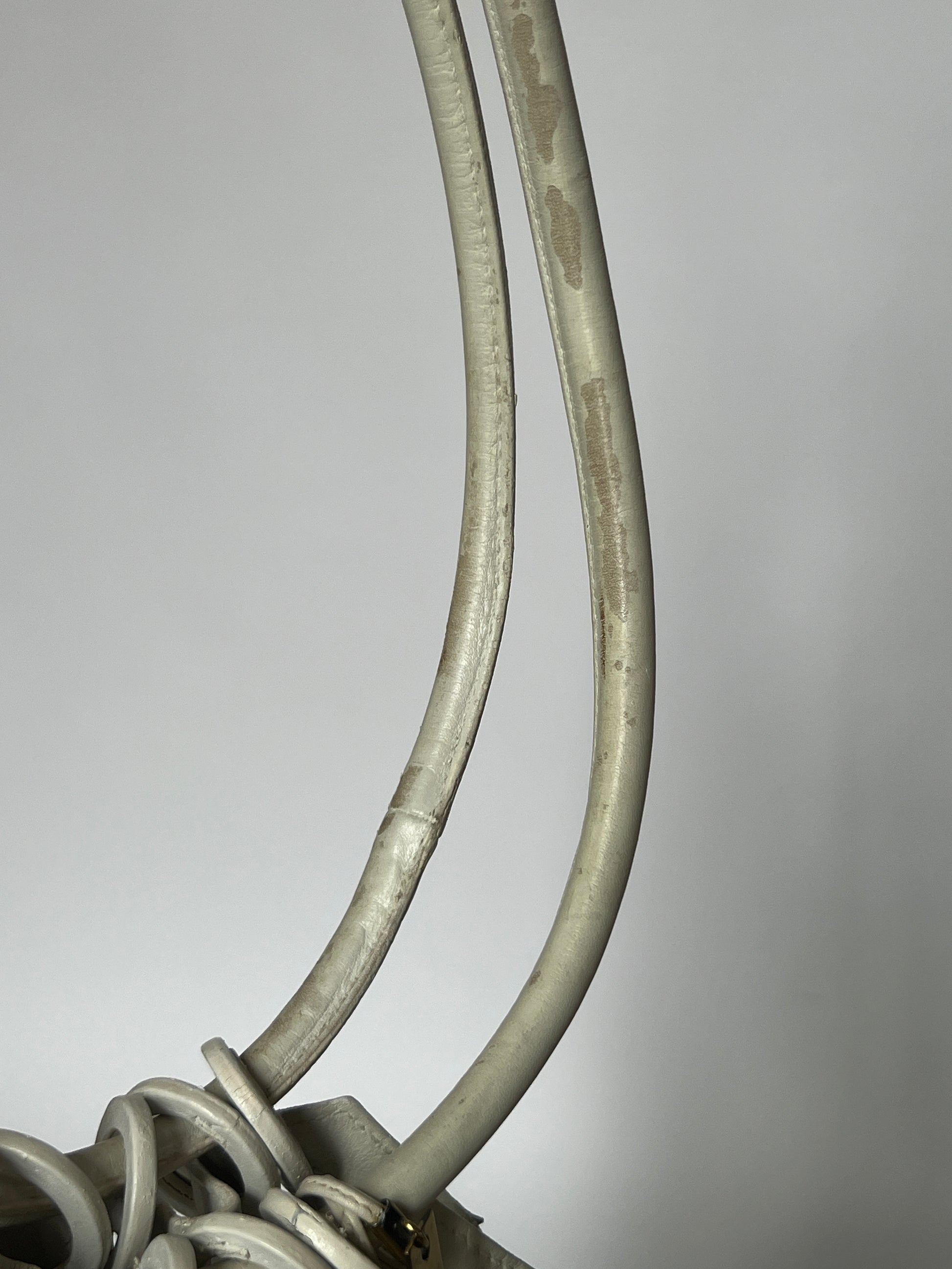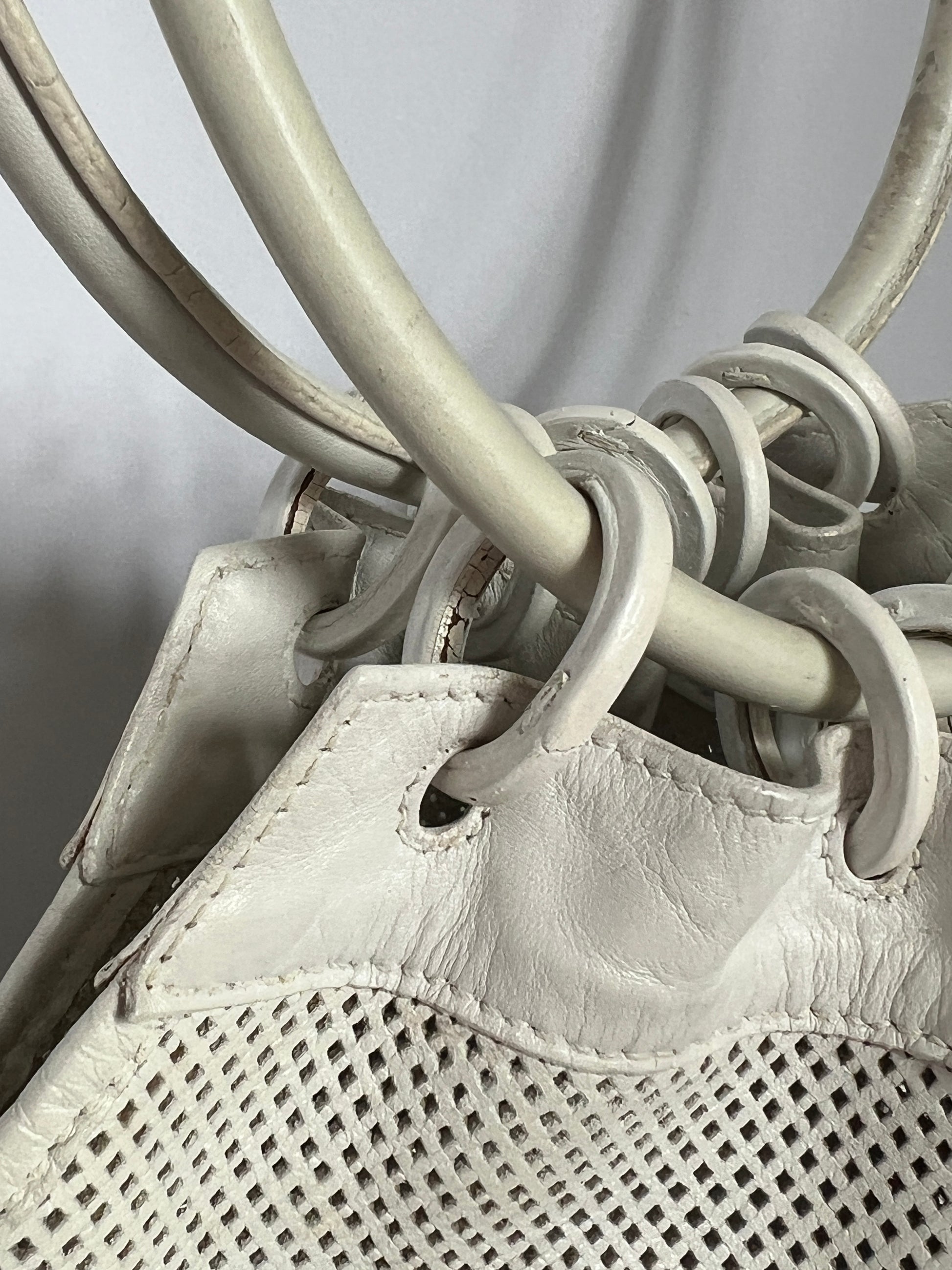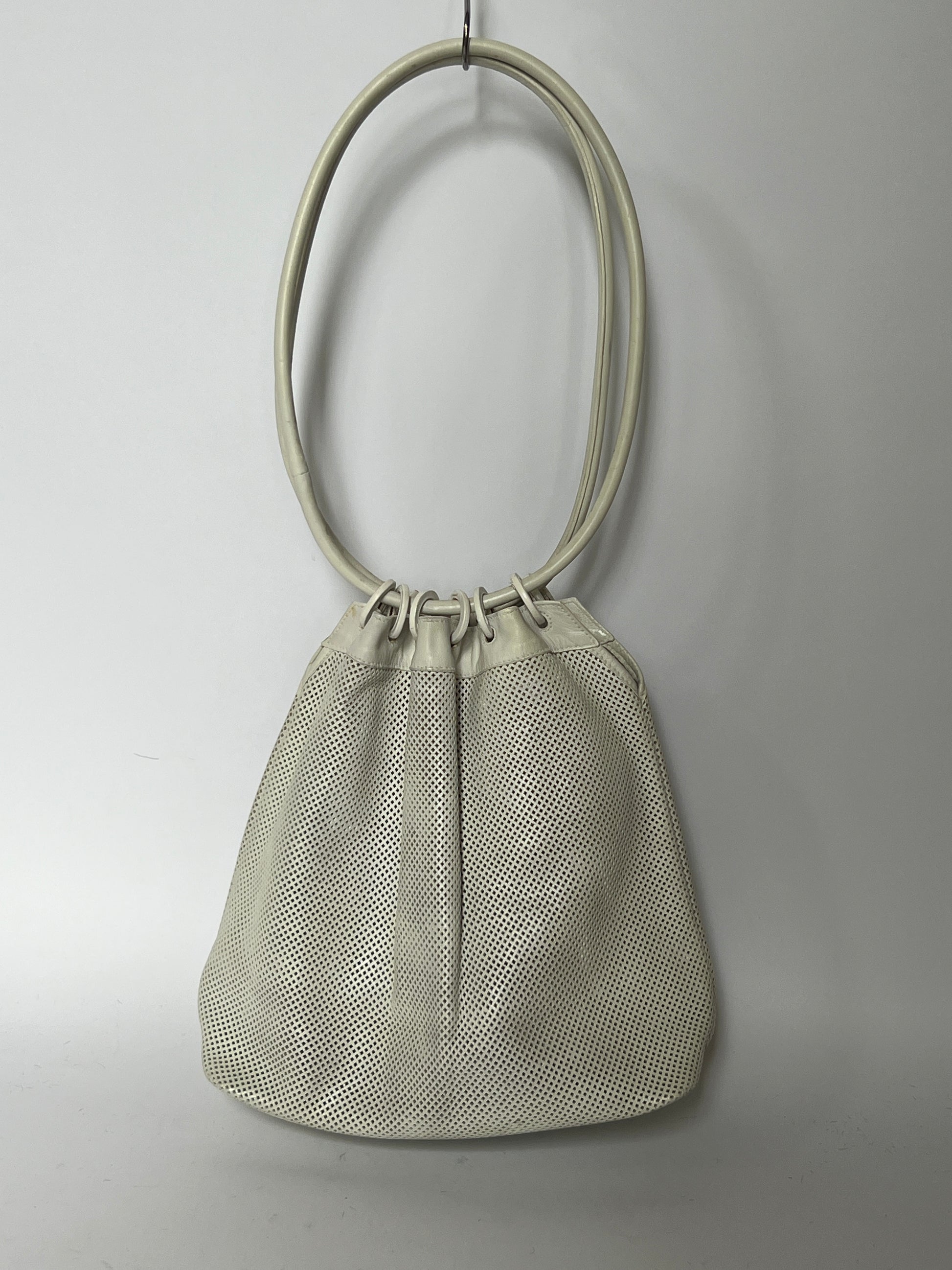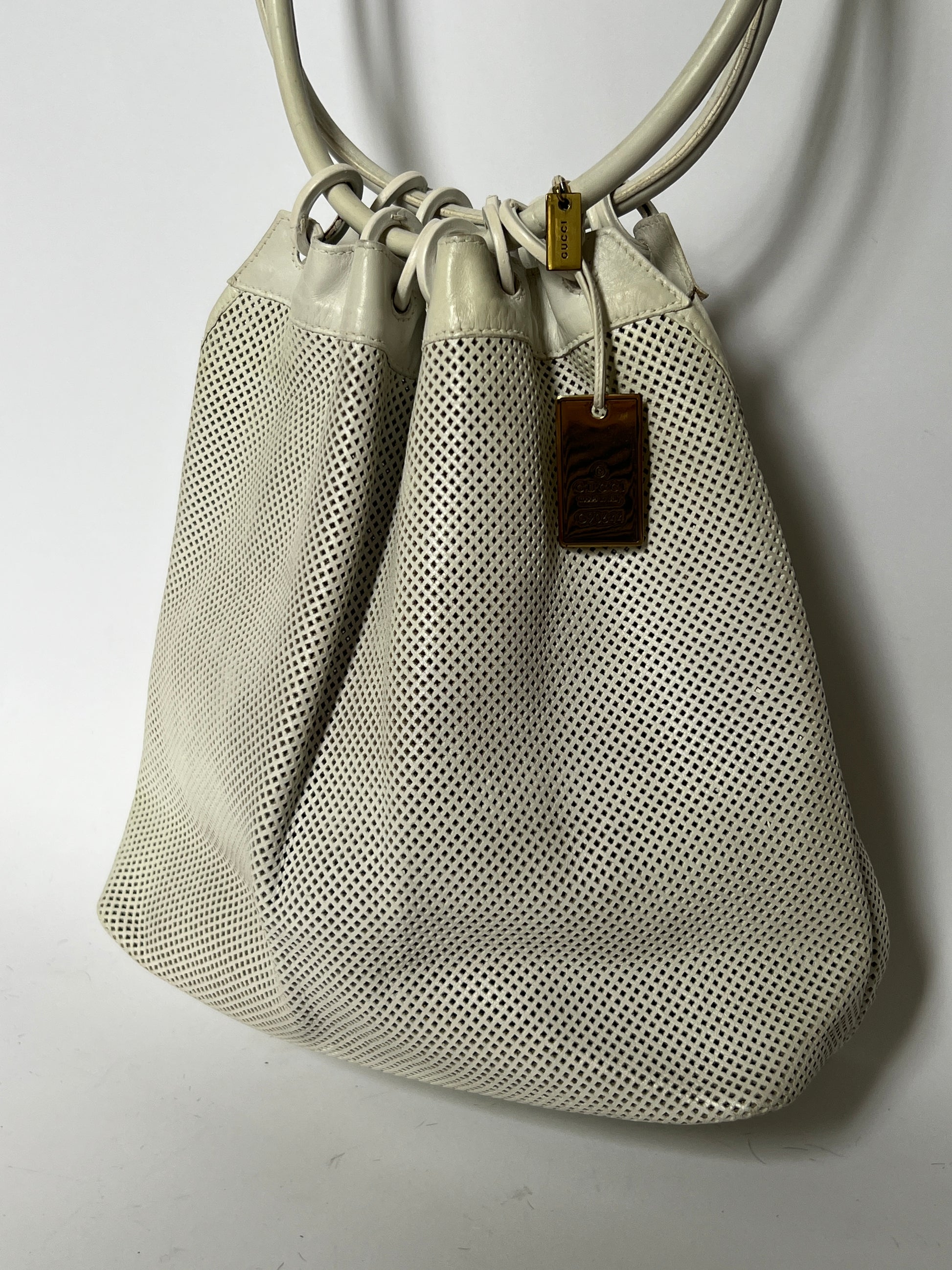 Crafted in perforated white leather with sculptural double ring handles, this piece embodies that quiet, confident era of Gucci — minimal, sensual, and slightly rebellious. The soft mesh texture gives it depth and movement, while the oversized circular handles make it instantly recognisable and editorial.