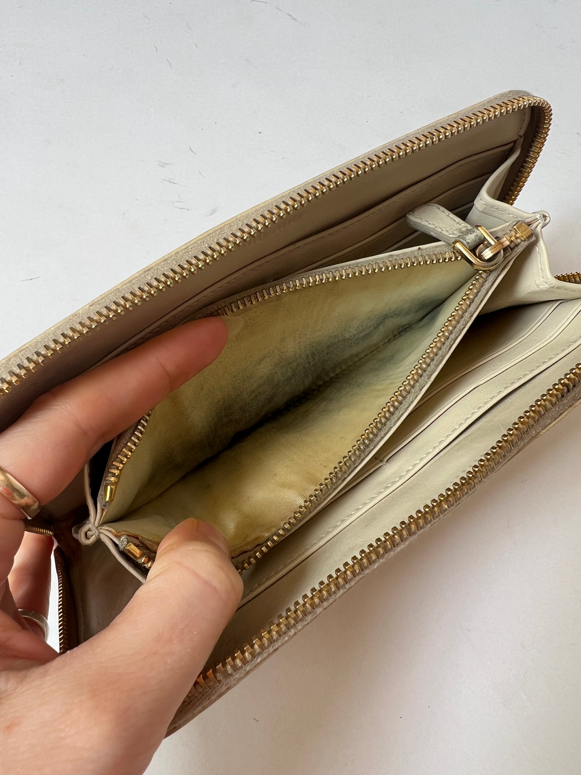 A chic early-2000s zip wallet by Miu Miu, crafted in glossy cream/beige croc-embossed leather. The wallet features a classic continental zip around format with gold-toned hardware and a spacious interior designed for everyday use.