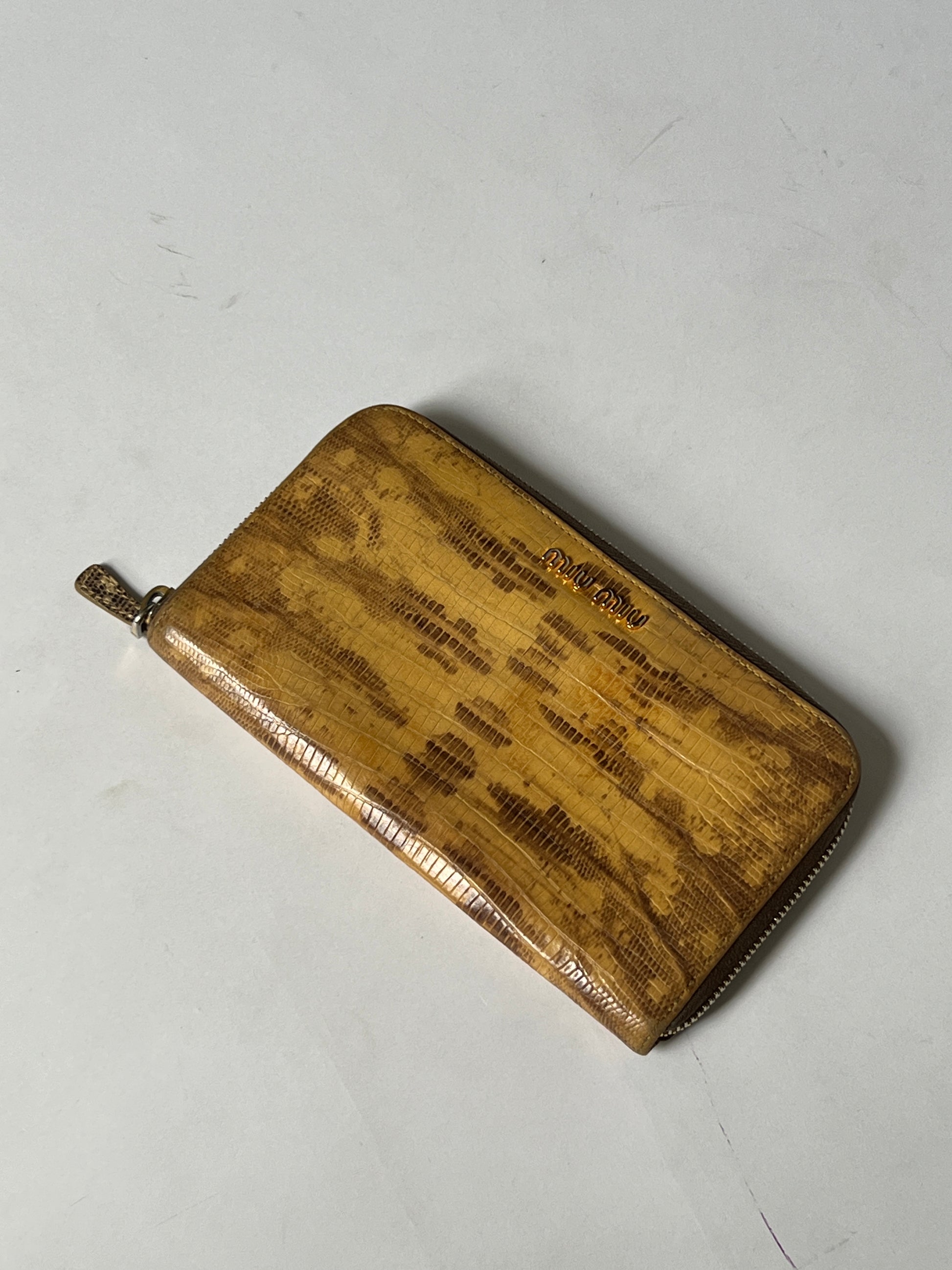 A distinctive Miu Miu zip-around wallet crafted from genuine leather in a warm python embossed mustard tone. Featuring a slim, elongated silhouette, this piece balances practicality with statement texture.