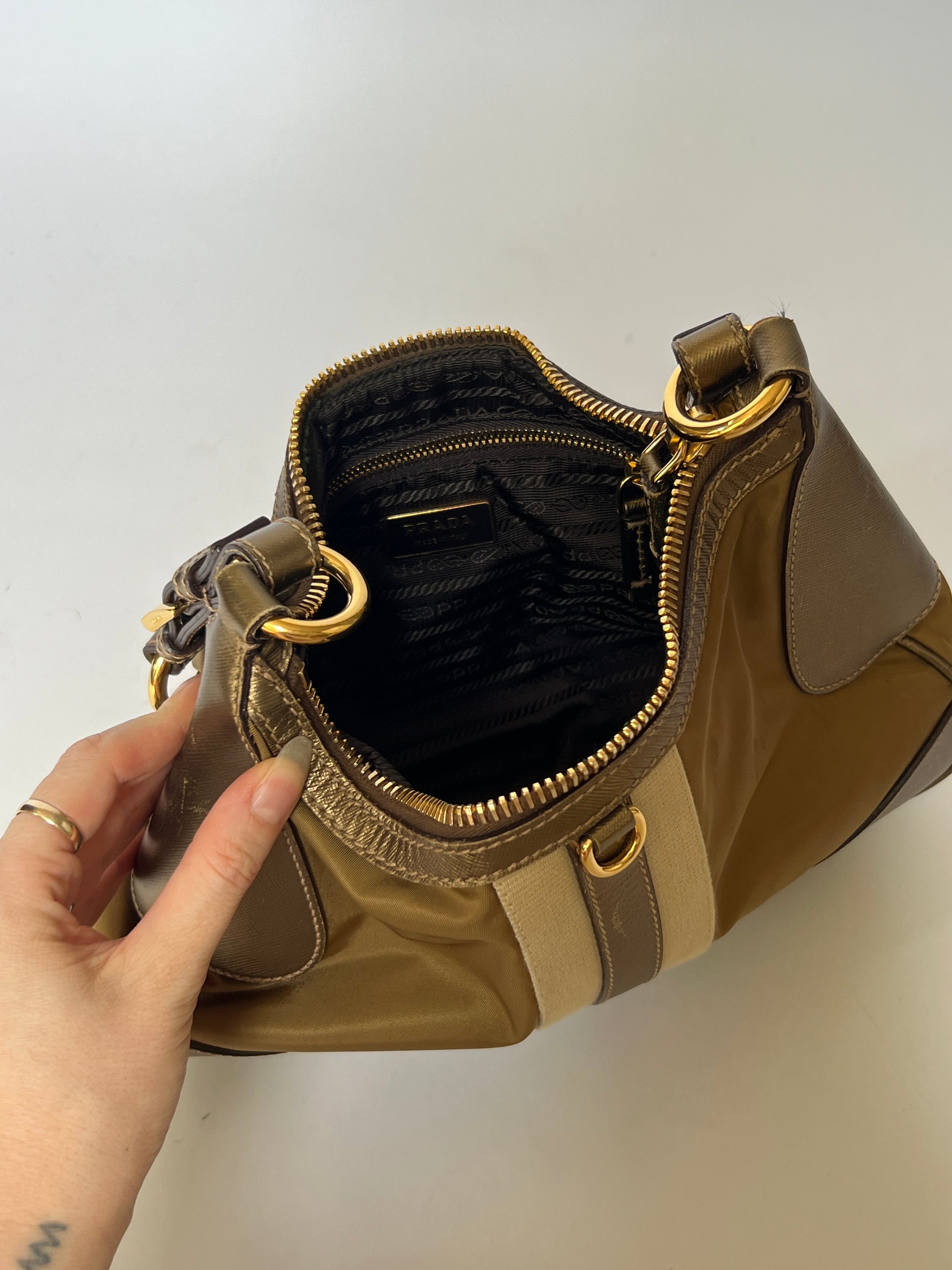 An early 2000s Prada Tessuto Sport shoulder bag crafted from signature caramel-toned nylon with metallic gold saffiano leather trim. Featuring the iconic Prada Milano triangle plaque and twin racing stripe detail, this piece captures the sporty-luxe aesthetic that defined the house in the mid 2000s.