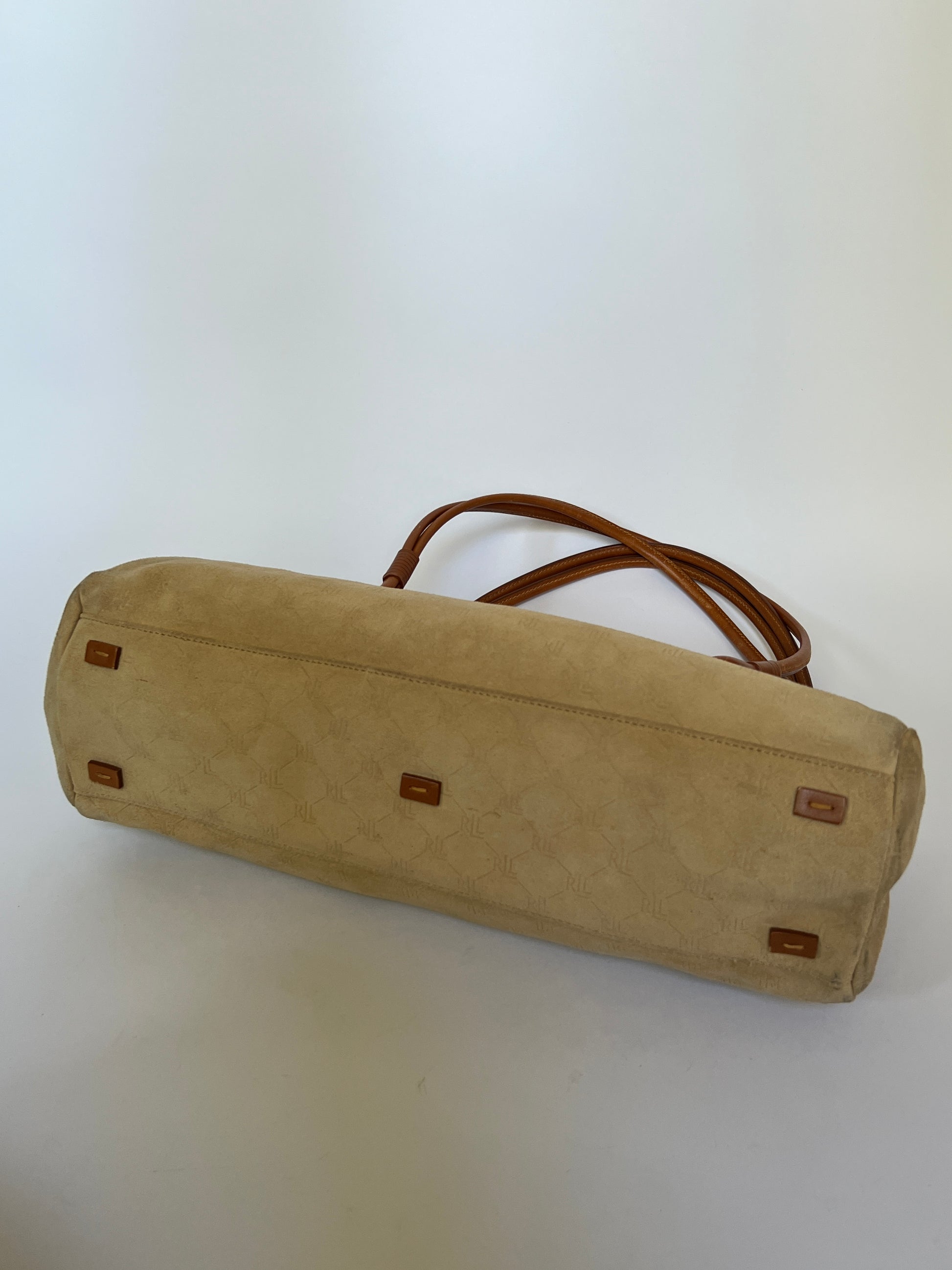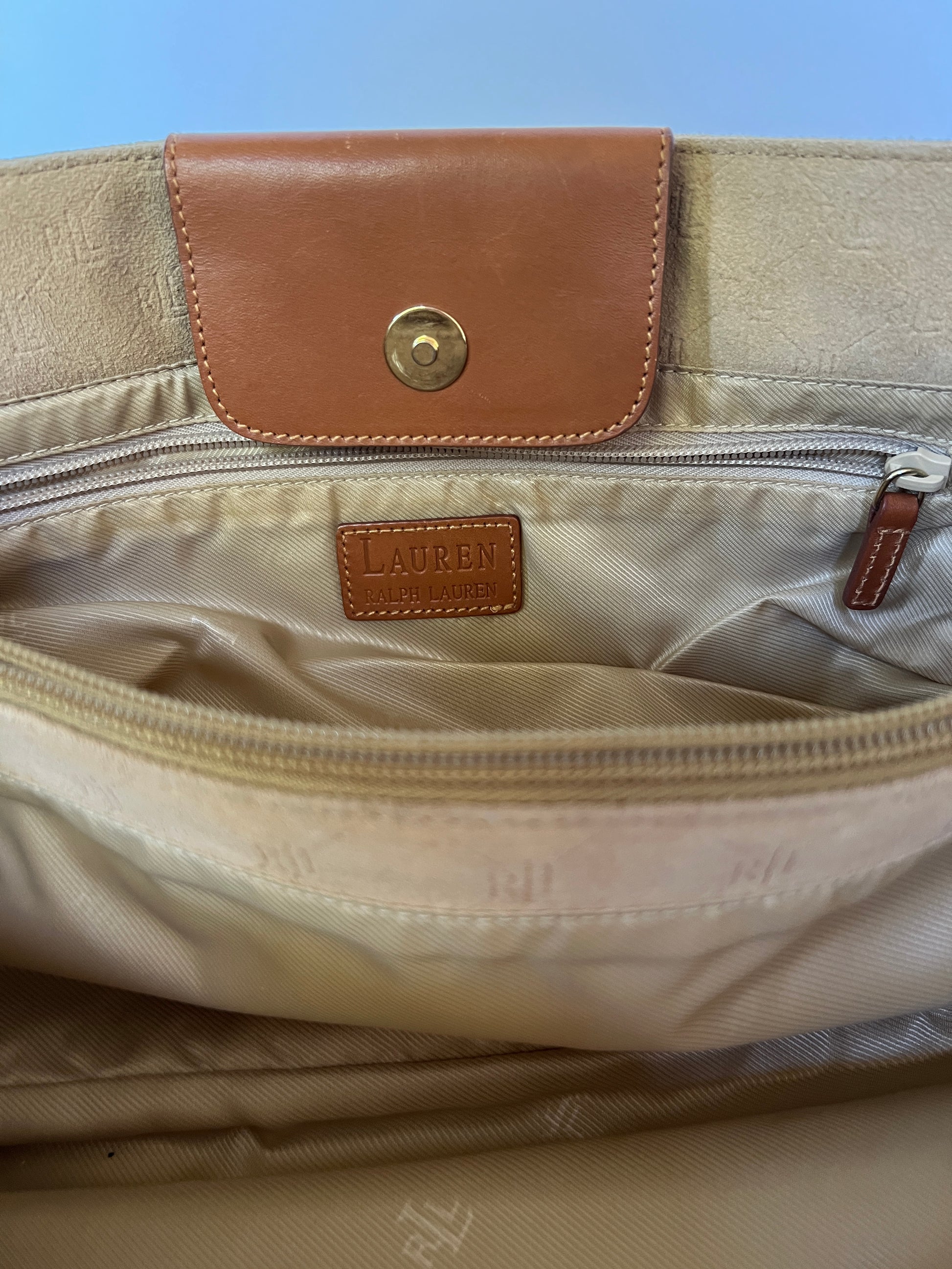 A timeless Ralph Lauren silhouette rendered in soft camel suede, finished with warm tan leather trims and subtle embossed monogram detailing throughout.
