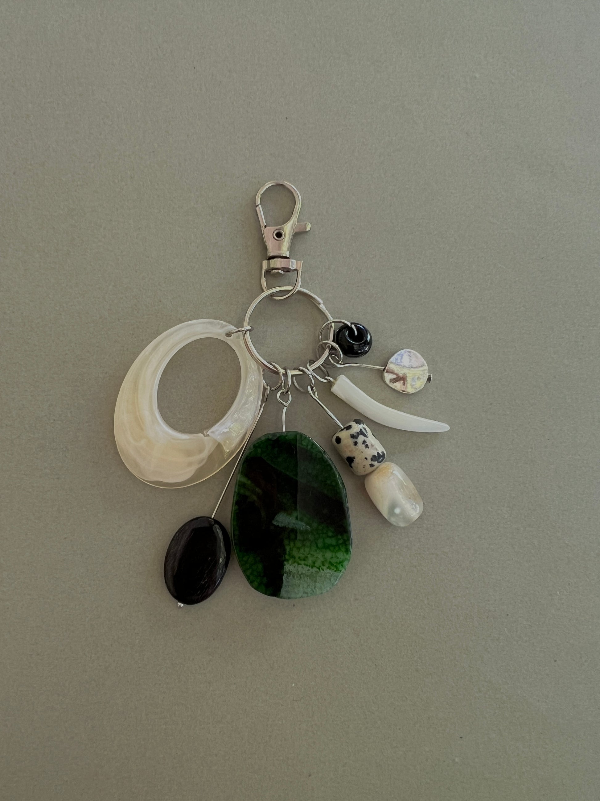 Acrylic, Wood, Green Dragon Vein Agate, Green Sakura Agate, Dalmatian Jasper, Mother of Pearl, Metal, Black Onyx, Stainless Steel.