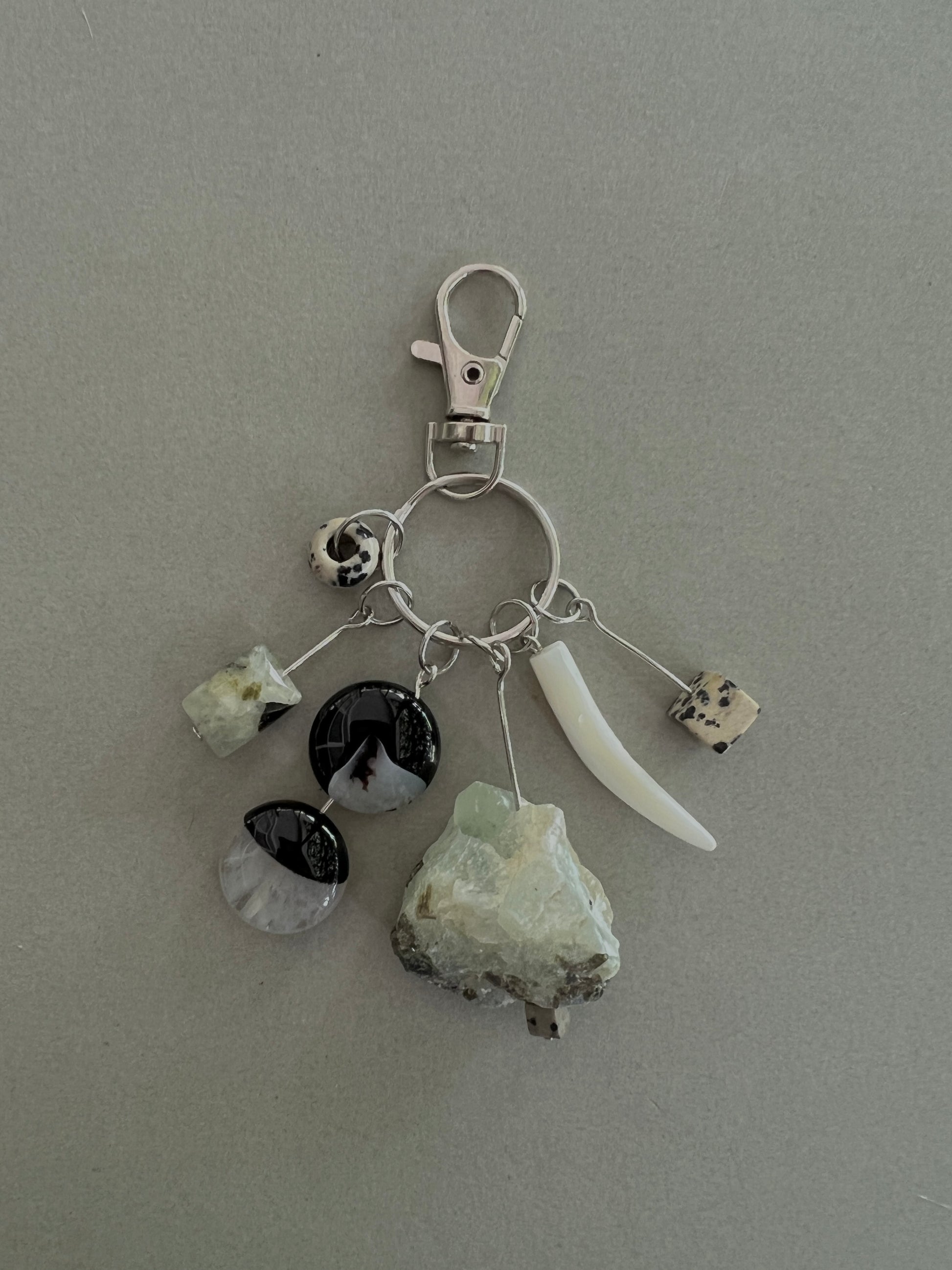 Mother of Pearl, Prehnite, Dalmatian Jasper, Black Agate, Stainless Steel.