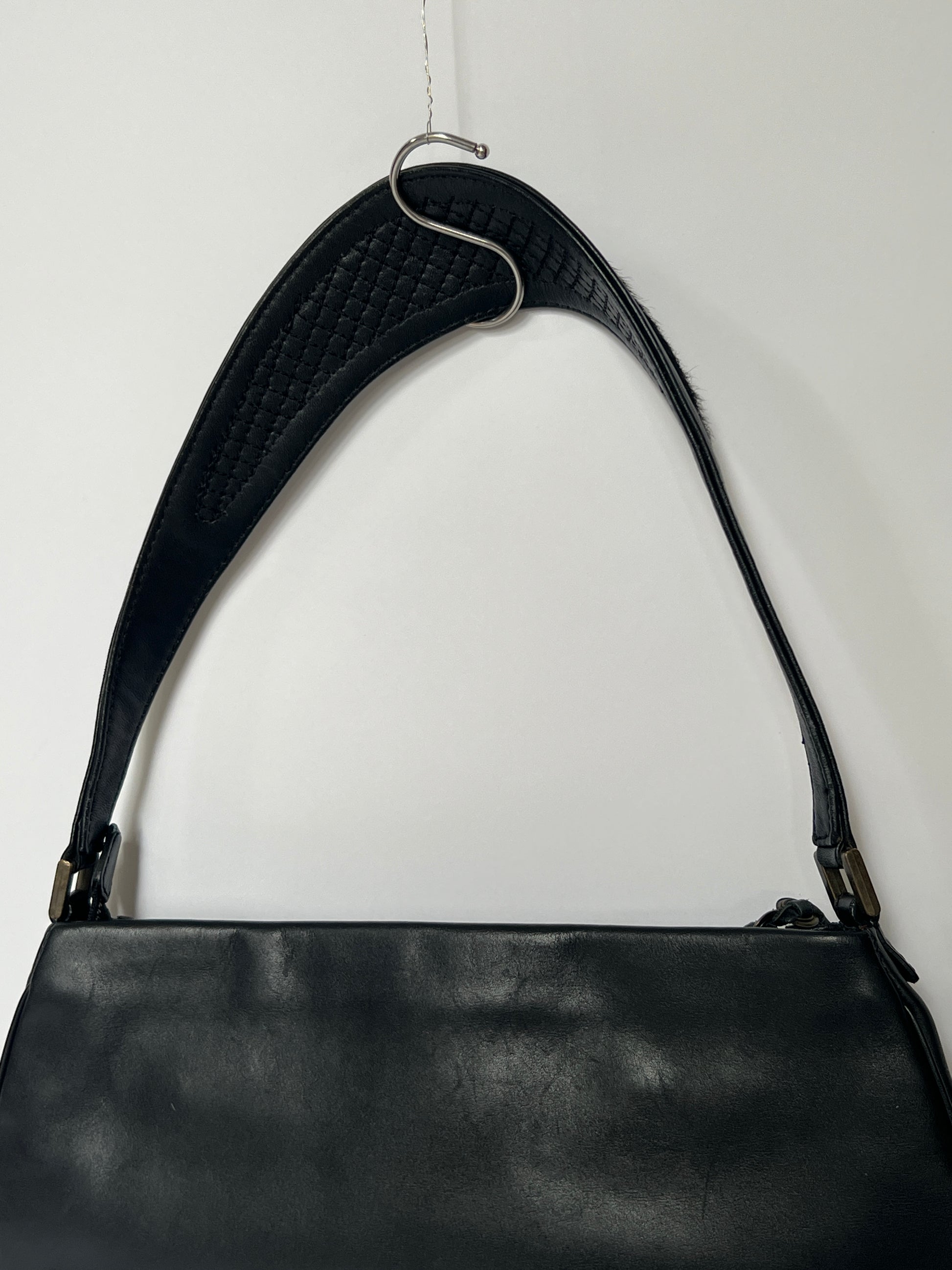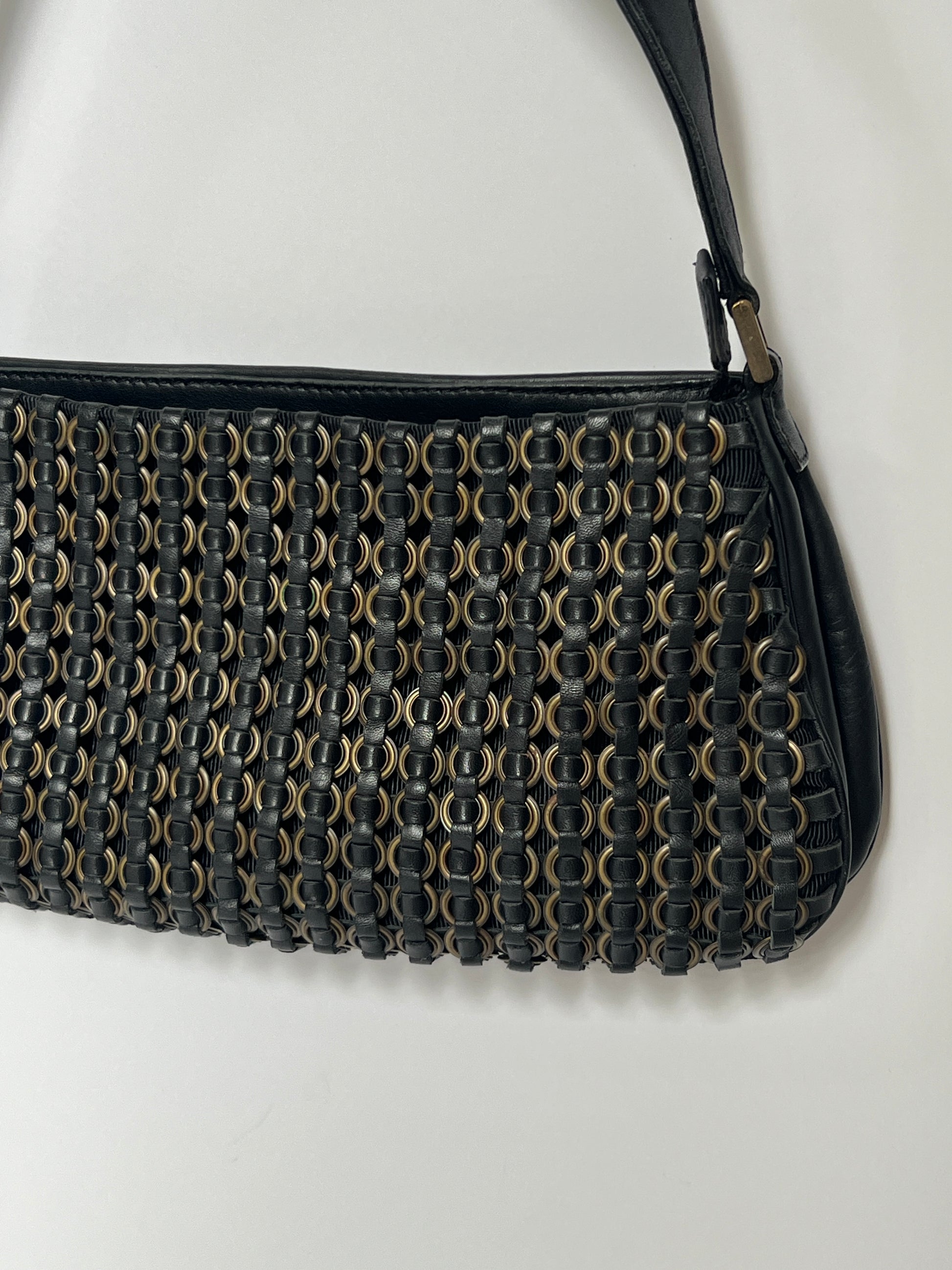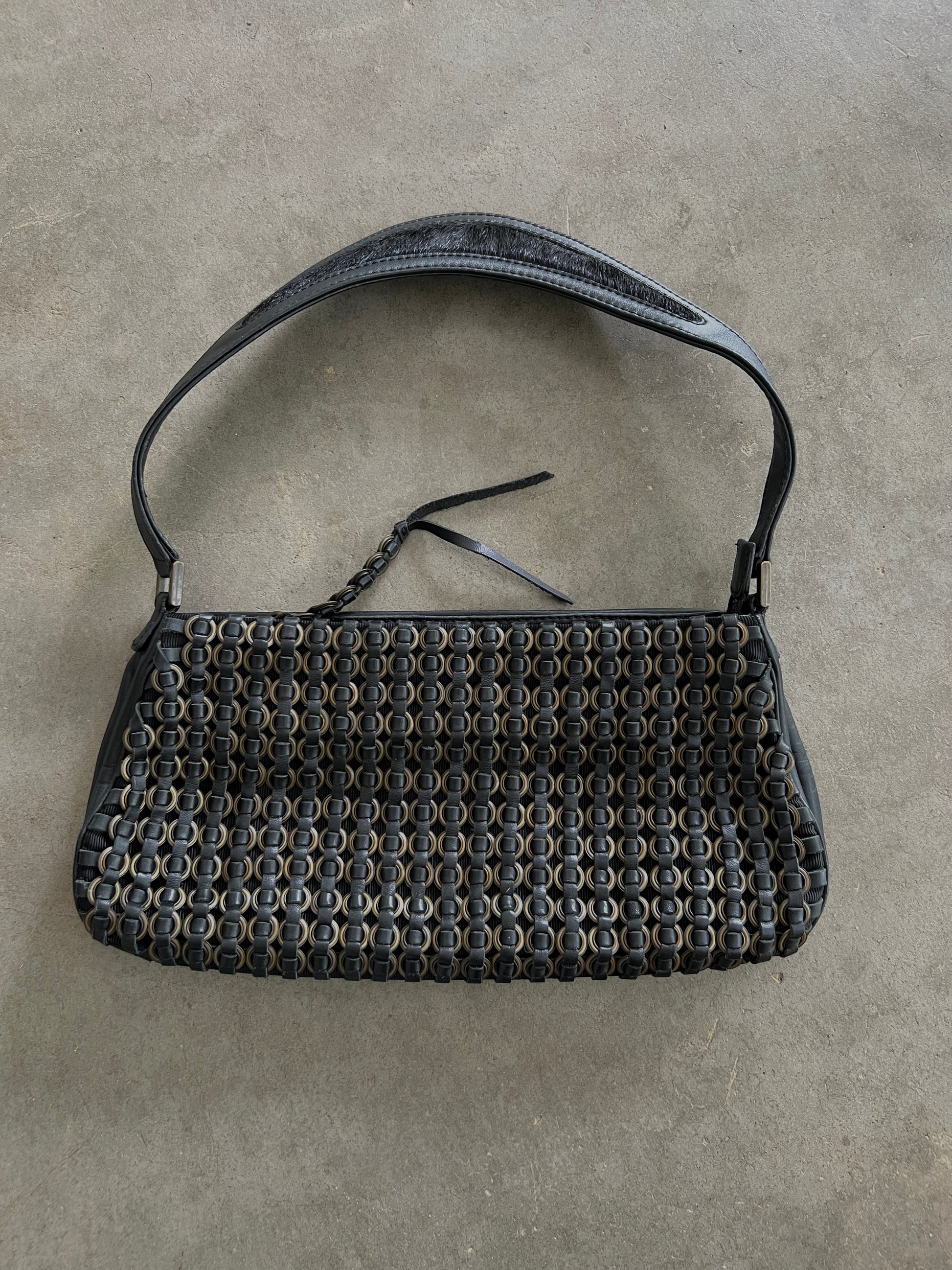 This vintage Francesco Biasia (Italy) shoulder bag pairs smooth black leather with an intricate woven metal ring overlay — creating a sculptural surface that feels both industrial and refined. The contrast pony hair handle adds depth and subtle edge, giving the piece that early-2000s Italian sophistication Biasia is known for.