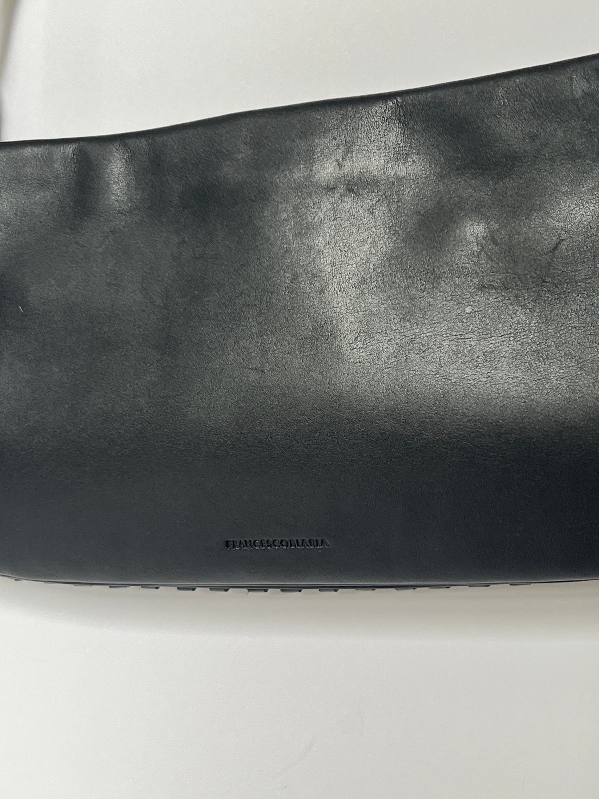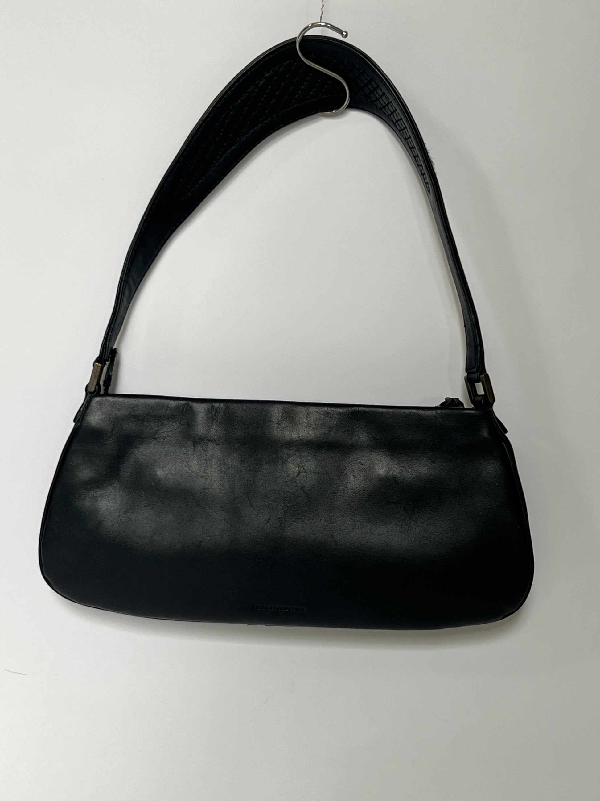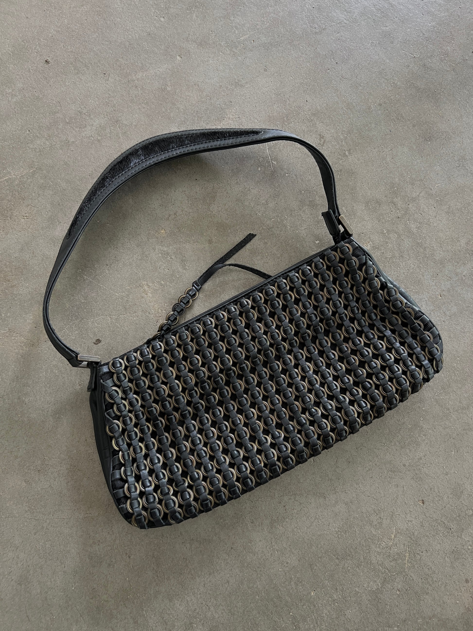 This vintage Francesco Biasia (Italy) shoulder bag pairs smooth black leather with an intricate woven metal ring overlay — creating a sculptural surface that feels both industrial and refined. The contrast pony hair handle adds depth and subtle edge, giving the piece that early-2000s Italian sophistication Biasia is known for.